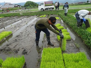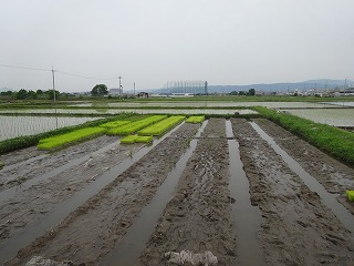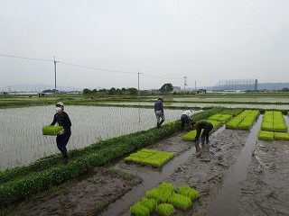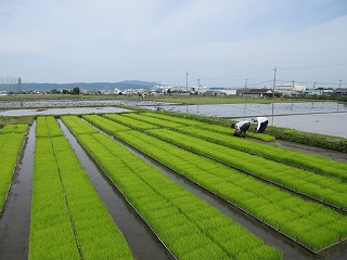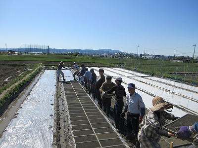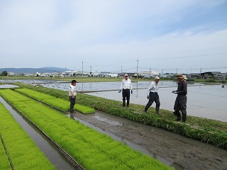 さわやかな天気のもとで苗代に苗箱をセットしました。約950個の苗箱を移動しました。