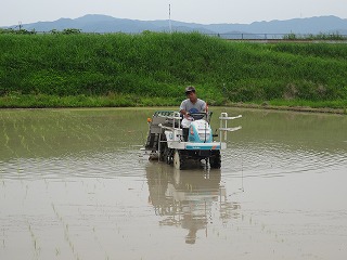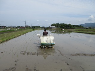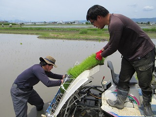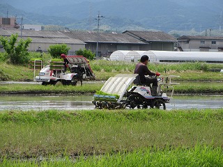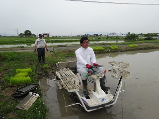 田植機にもう一人乗り込み、苗を植えながら撒いています。
