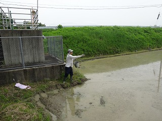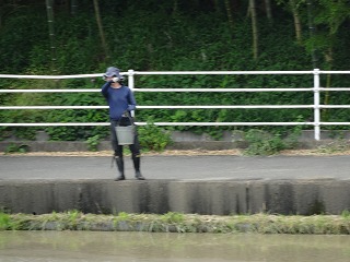 バケツを持って、畦から何かを蒔いています。