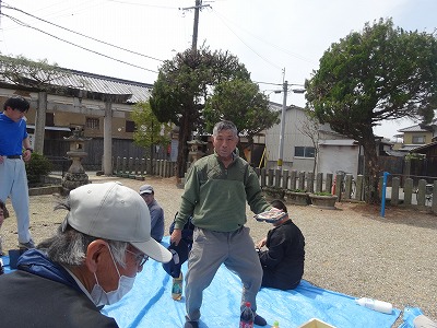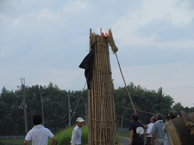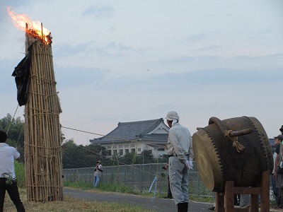 作業が終わった後、みんなで地域の行事(大たいまつ)を見学しました。広大寺池の土手に掲げられた大たいまつは高さ約3m、理事長もたいまつ作りに携わりました。大たいまつの由来は火を焚いて神仏を招き寄せ神の心を静め饗応(きょうおう)するためやたいまつがたおれた方向の稲の豊作を占うという意味があるそうです。(諸説あり)