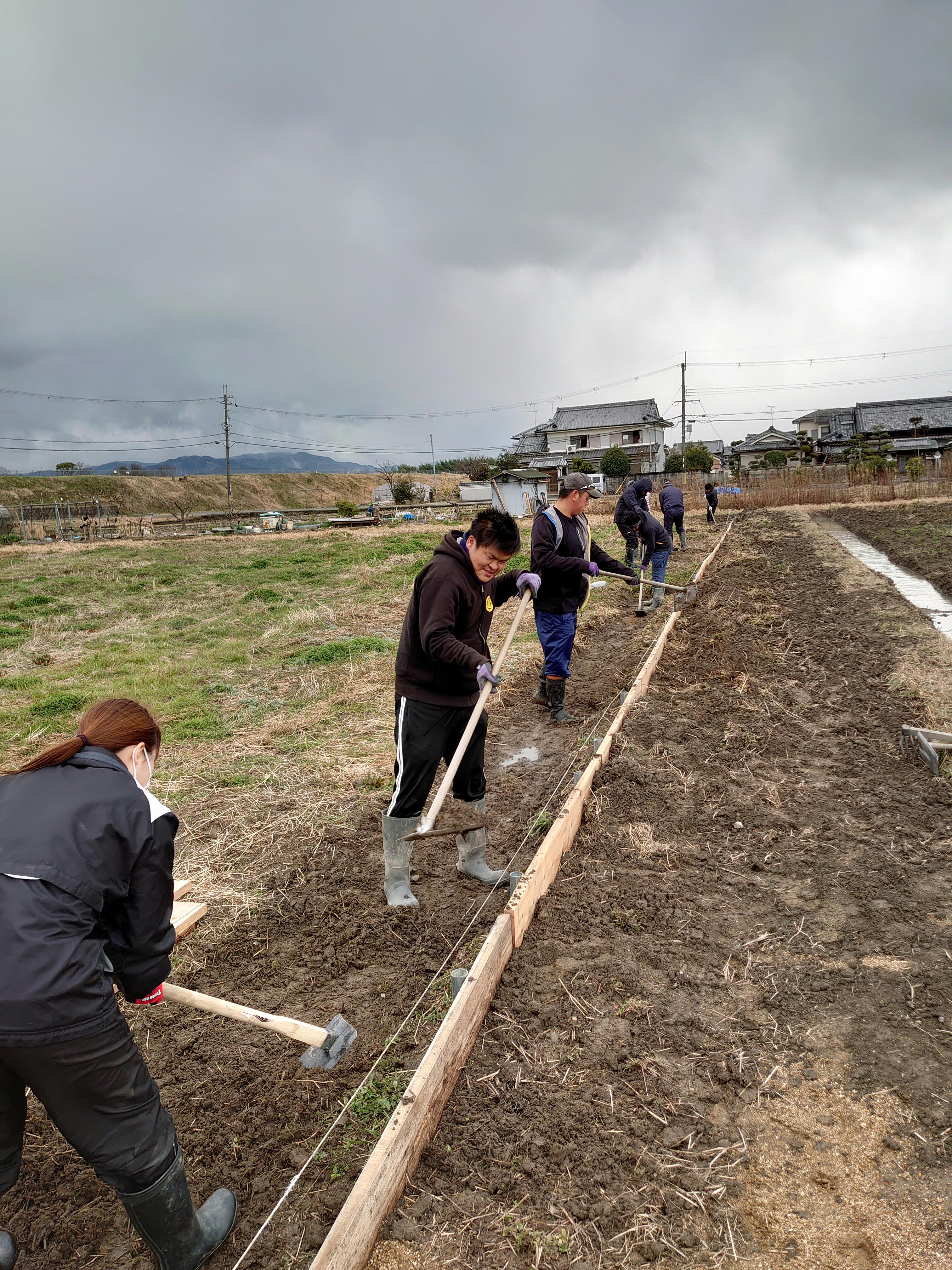 実際に、訪れてみると明るく元気な利用者さんがほとんどで、楽しそうに活動されていました。今日は、朝のミーティング後にラジオ体操とストレッチをし、ブルーベリー畑の道作りに参加させてもらいました。今朝は少し吹雪いていたほど寒い日で、外での作業を考えると憂鬱になるほどでした。しかし、寒い中でもみんなで作業を進めていき、最初は使い方も分からなかったクワも少しずつ使い慣れ、道もできていくと達成感が得られてどんどん楽しくなっていきました。休憩時間も利用者さんは手押し相撲をしたりして遊んで、とても楽しい雰囲気でした。みんなで身体を動かして作業をしていると身体だけでなく心まで元気になるのだなと感じました。利用者さんが明るく元気な理由もわかる気がしました。