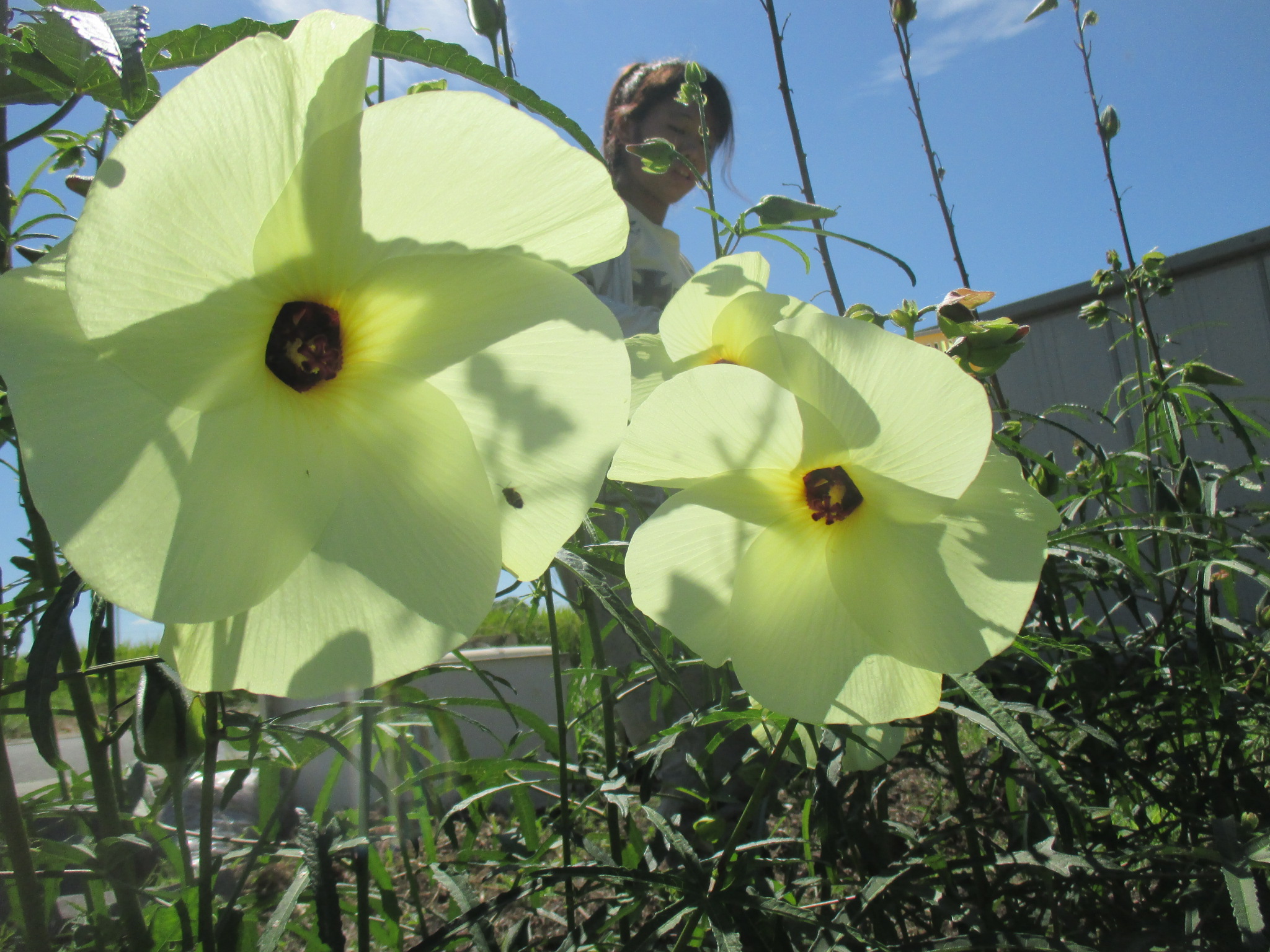 まだまだ気温が高く、暑い中でしたが、みなさんと作業ができて、とても楽しかったです。特に「みんなの畑」では、みなさん一生懸命作業をしていらっしゃいました。ナスや里芋、花オクラなど様々な野菜を育てていらっしゃいます。花オクラは、名前の通り花びらの形をしたオクラです。その見た目からは想像しがたいですが、実際に食べてみると、オクラのようにねばねばとしていました。そのまま食べても茹でてしょうゆなどで味付けしても美味しいそうです。