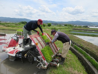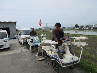 運転する人とサポートする人がペアを組んで、田植えを行います。