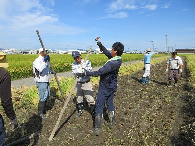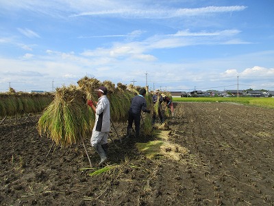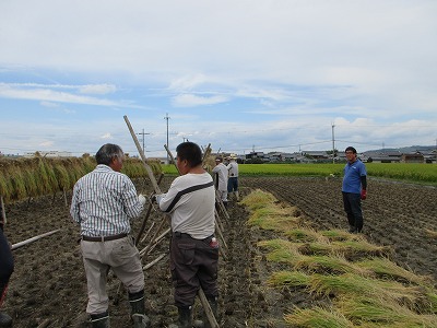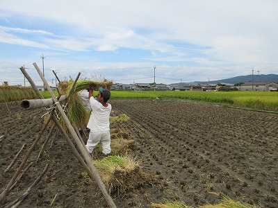 2025/10/3 はさがけの作業を行いました。もち米を天日干しします。