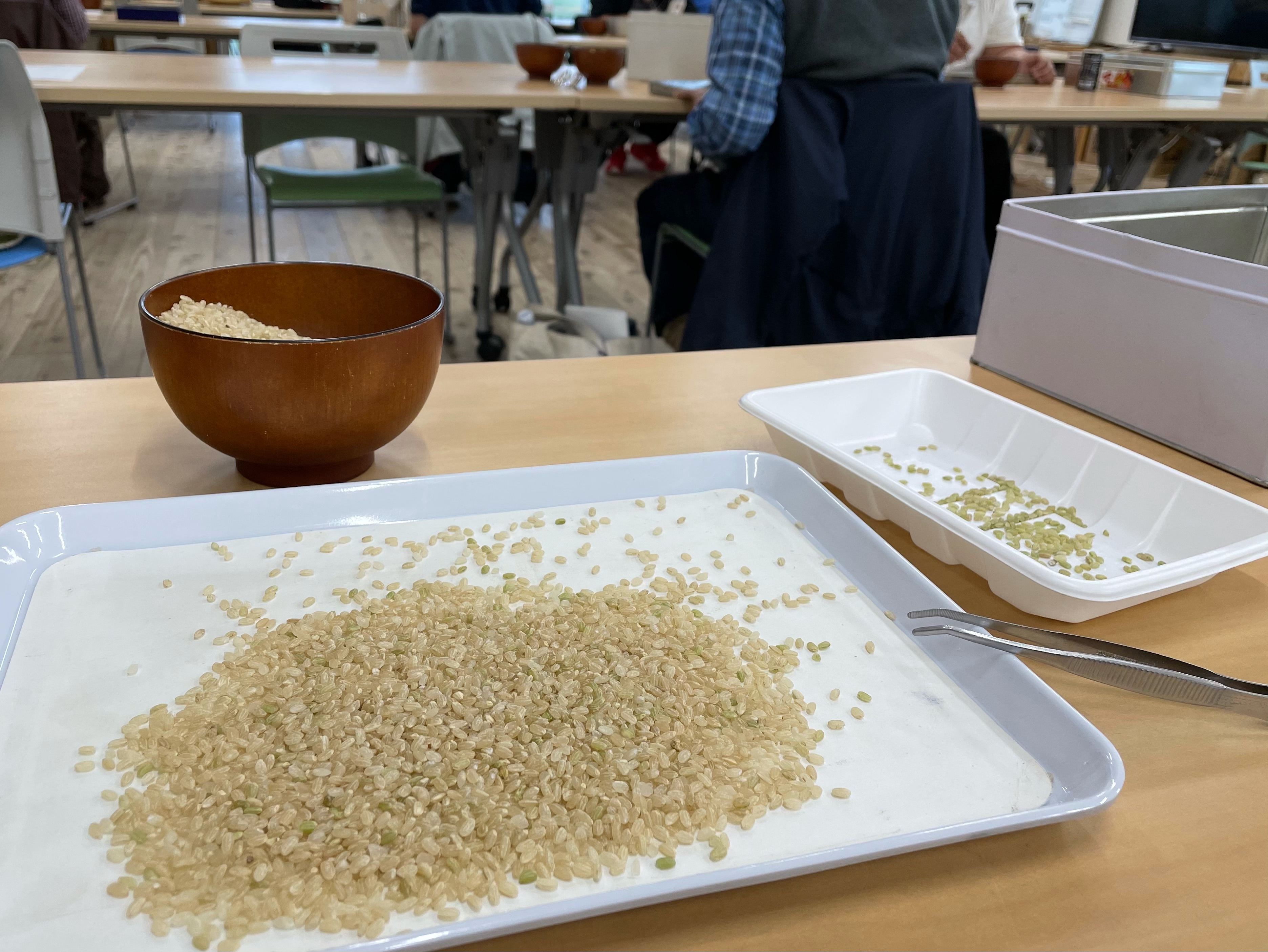 その日の午後からは玄米そうじを行いました。玄米そうじとは、玄米から目視で石や緑の未熟粒、黒く傷んでいる粒などを取り除く判別作業です。目視で判別し、ピンセットで一粒ずつ取り除く地道で根気のいる作業でした。米は育てるだけでなく、商品として販売するまでの処理も大変なんだと実感しました。