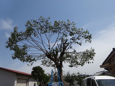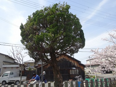 アンダンテ植木で30年ほど放置された樹木を剪定しました。お化けのようになった木々を小さく形を出すに苦労しました。中央の木が本殿によりかかっているので台風などで倒木したら本殿が損傷してしまう恐れもありました。裏のお家のご協力で高所作業車を敷地内へ入れさせて頂いて作業することができ、スムーズに作業できました。作業の前には神主さんに来てもらって地鎮祭をしていただきました。